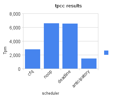 I mentioned earlier that IO scheduler CFQ coming by default in RedHat / CentOS 5.x may be not so good for MySQL. And yesterday one customer reported that just changing cfq to noop solved their InnoDB IO problems. I ran tpcc scripts against XtraDB on our Dell PowerEdge R900 server (16 cores, 8 disks in RAID10, controller Perc/6i with BBU) to compare cfq, deadline, noop and anticipatory (last one just to get number, I did not expect a lot from anticipatory).