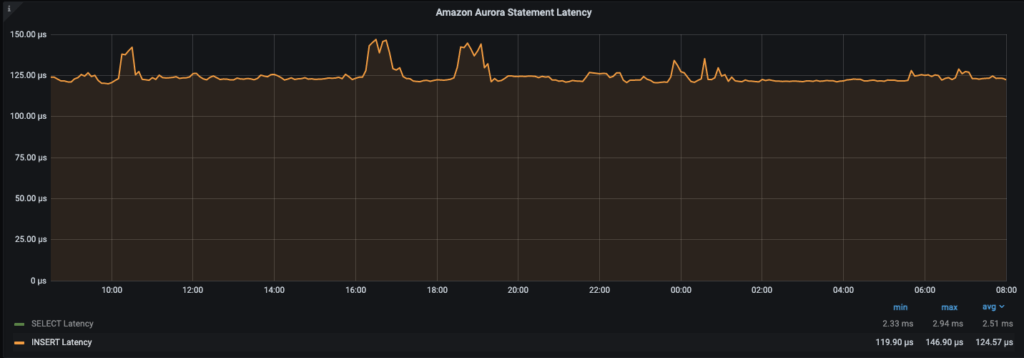 These numbers were very impressive compared to my previous experience so, being extra curious, I checked what was reported in Cloudwatch for Aurora Write latency for the previous 3 days.