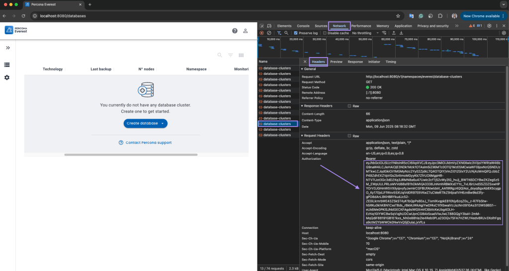 Once our database is created, the next step is to check what’s running in our cluster. Let’s list all available clusters. The Percona Everest API also provides an endpoint to list all database clusters in a specific namespace.