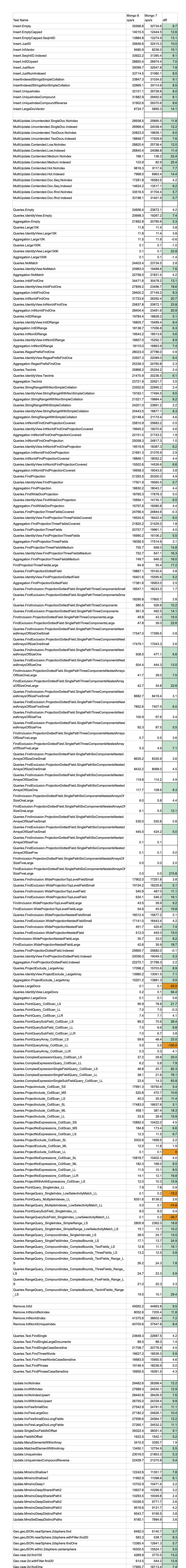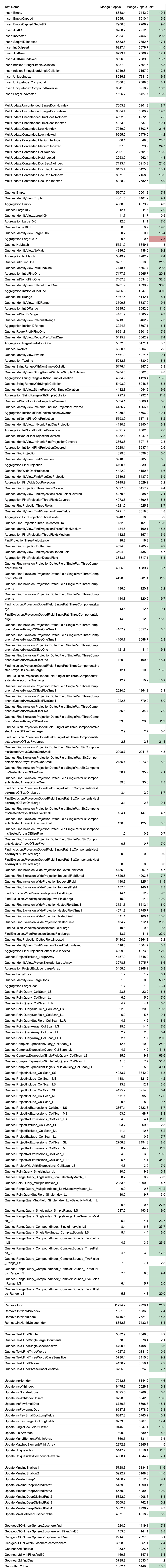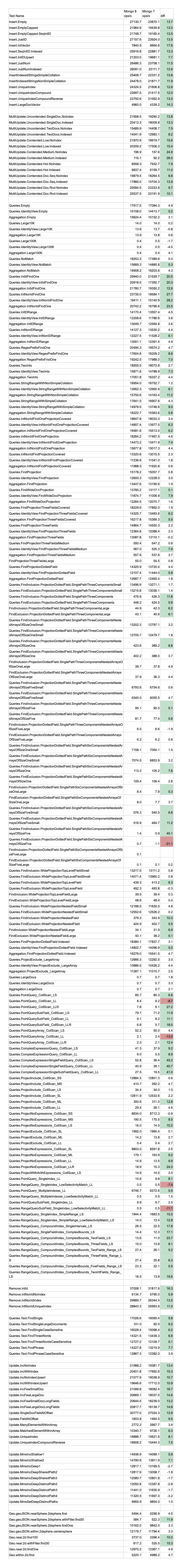 I’ve highlighted in green when there is more than a 5% difference in favor of MongoDB 8. Red is used when MongoDB 7.0 is more than 5% faster for the specific test. Here are the raw numbers (you might want to open each image on a new browser page for readability):