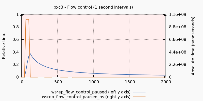 During the whole process, wsrep_flow_control_paused and wsrep_flow_control_paused_ns are recorded every second with mysqladmin ext -i1. We can then build a graph of the evolution of both variables: