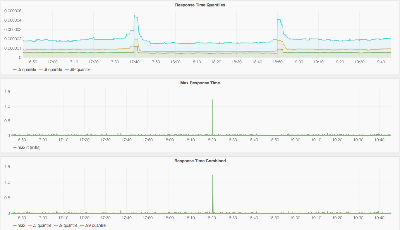 For a second approach, I decided to live with less fidelity and settled for some quantiles and a max. For this, I created a simple Prometheus exporter that exposes 0.5, 0.9 and 0.99 quantiles, and also the max response time for every five second period.
