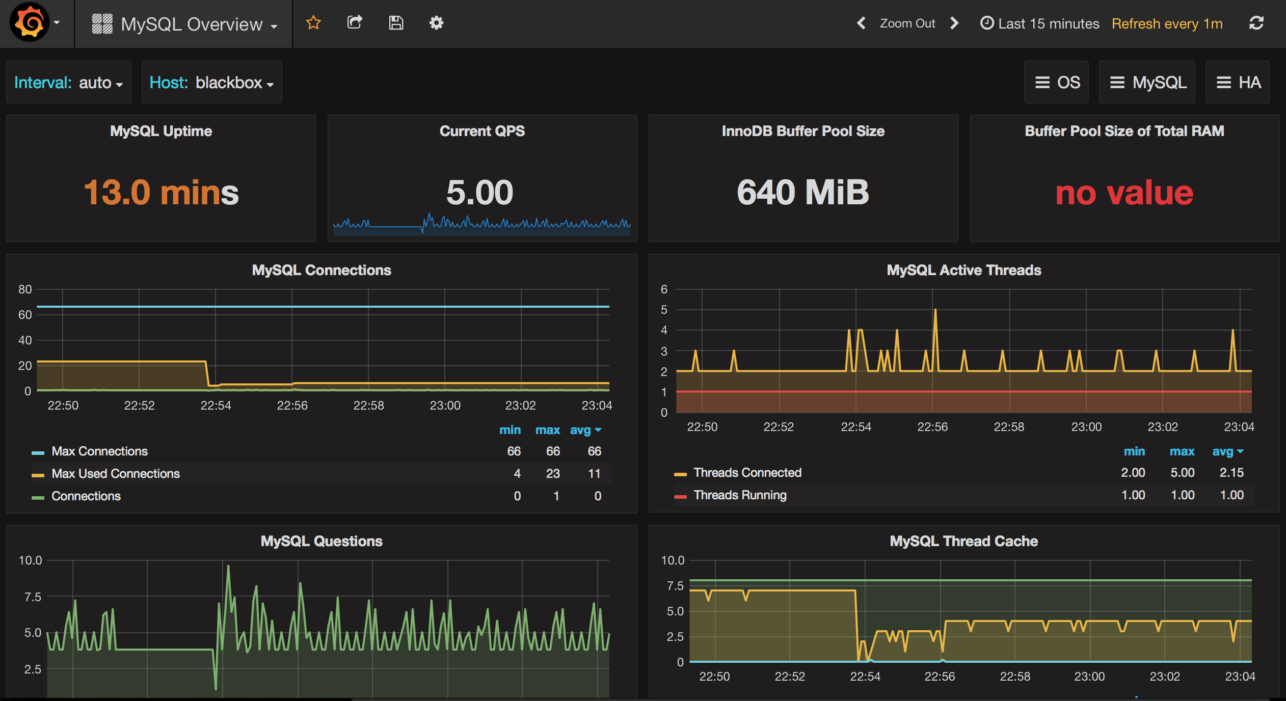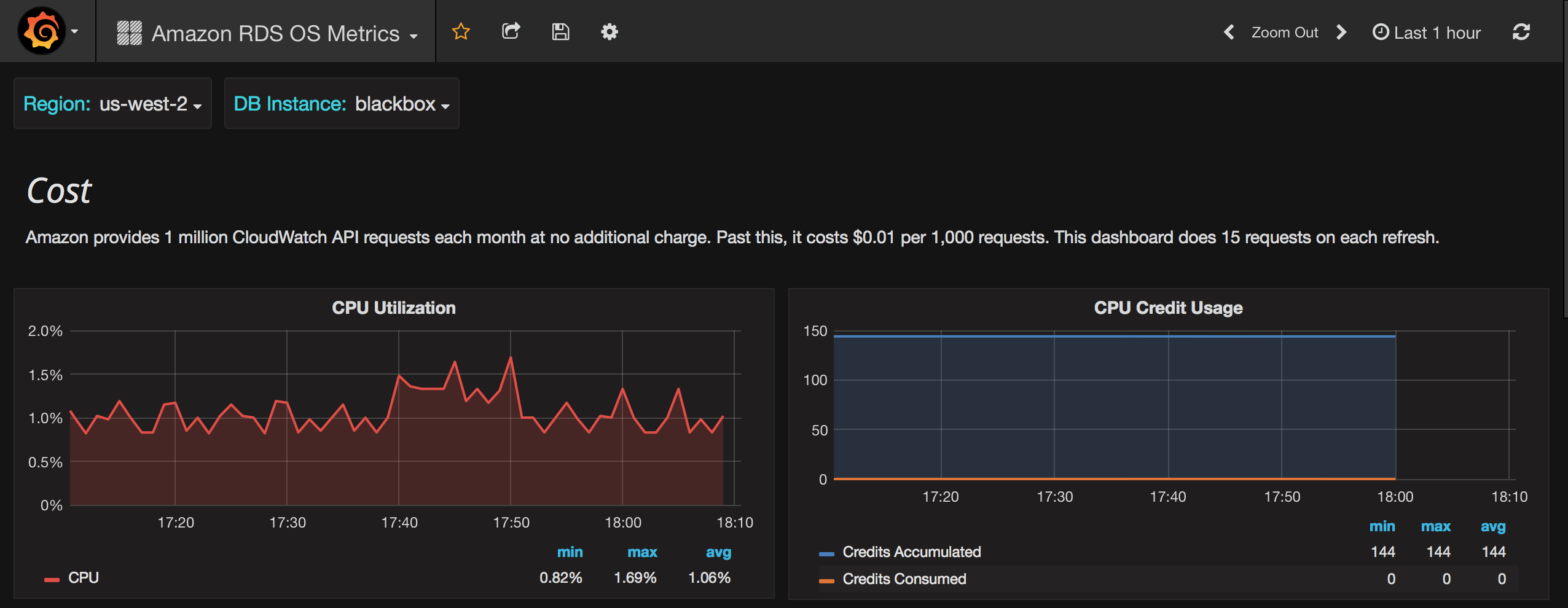 “Amazon RDS OS Metrics” dashboard will also be a part of the next release of Percona Monitoring and Management (PMM). If you are already using it, you can use the same instructions as in this blog post, but on step two you have to create a local credentials file (say /root/aws_credentials) and share it with pmm-server container by adding “-v /root/aws_credentials:/usr/share/grafana/.aws/credentials -e HOME=/usr/share/grafana” with the create command.