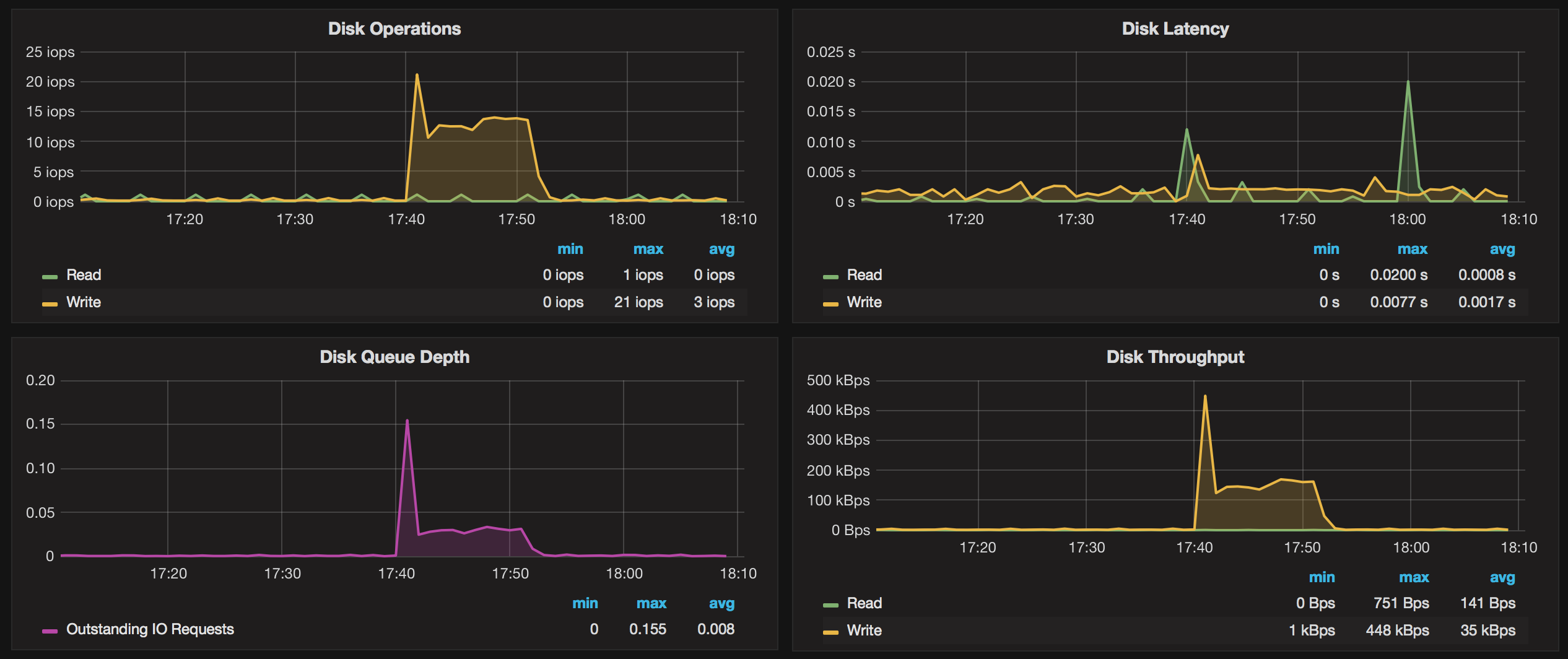 Here are the disk performance graphs (I am using a magnetic drive, and we shouldn’t expect many iops):