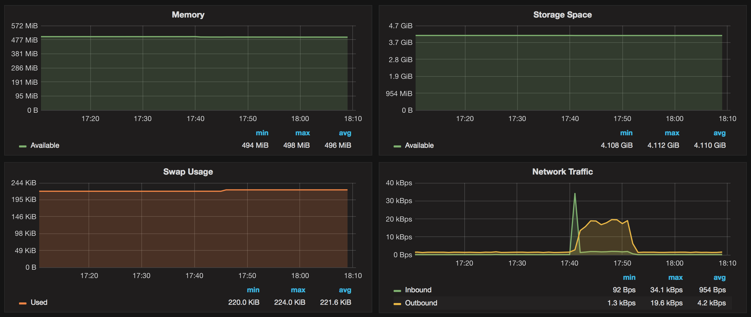 The dashboard uses 60s resolution and shows an average over each datapoint. An exception is the “CPU Credit Usage” graph, which has a five min. average and interval length. All data is fetched in real-time and not stored anywhere.