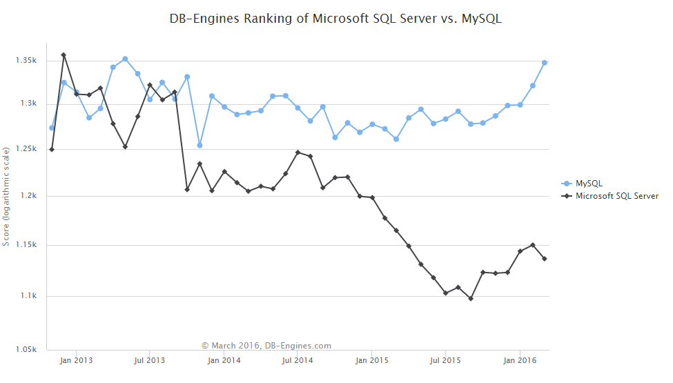 Windows users should be plenty familiar with MySQL, it used often enough by people already trying to cut down on licensing costs, and is increasing in popularity against SQL Server – as evidenced by this graph: