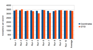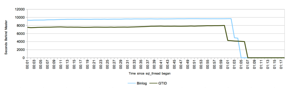 In every test run, GTID took slightly longer to fully catch up than the traditional method. There are a couple of reasons to expect GTID’s to be slightly slower. One possibility is the that there are additional writes on the slave, in order to keep track of all the GTID’s that the slave ran. I removed the initial write to the relay log, but we must retain the committed GTID, and this causes additional writes. I used the default settings for MySQL, and as such log_slave_updates was disabled. This causes the replicated GTID to be stored in a table, which is periodically compressed. You can find more details on how log_slave_updates impacts GTID replication here.