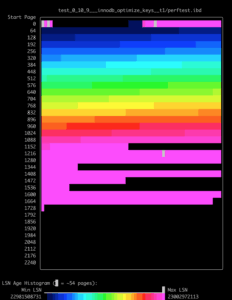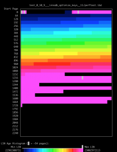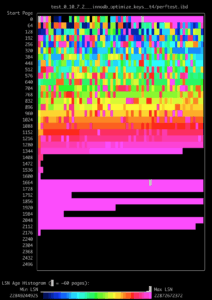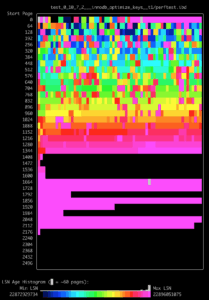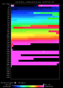 The graphs below were made with innodb_ruby (more info about it in this blog post) and based on a table of 131K rows with –rows 100. The intention of this test was to create a lot of files that will cause better spread in the Primary Key. The timings are over the same table structure but the table has 32M rows. Finally, I performed the test with 1 and 4 threads and with –innodb-optimize-keys when possible.
