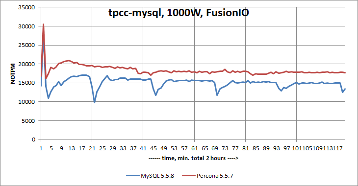 You can see that MySQL 5.5.8 has periodic drops here, too. The margin between Percona Server and MySQL is about 2500-2800 NOTPM (~15% difference).