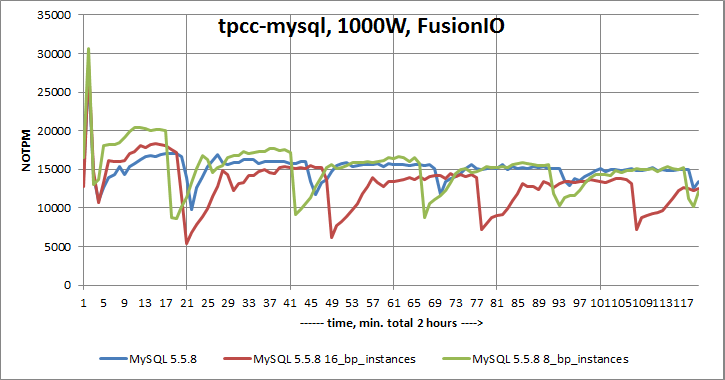 As you see, having several buffer pools makes the dips deeper and longer. It seems that for Percona Server the best choice is innodb_buffer_pool_instances=1, as we implemented buffer pool scalability in a different way.