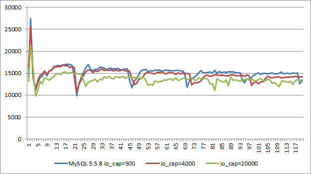 By request from commenter I put also results with different innodb_io_capacity for MySQL 5.5.8. It is 500 ( which I used in benchmarks above), 4000 and 20000.