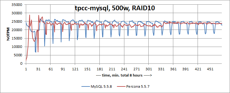 Although it takes a decent time for the Percona Server results to stabilize, for MySQL 5.5.8 we have regular dips (3 times per hour) from 24900 NOTPM to 17700 NOTPM (dips of around 30%).