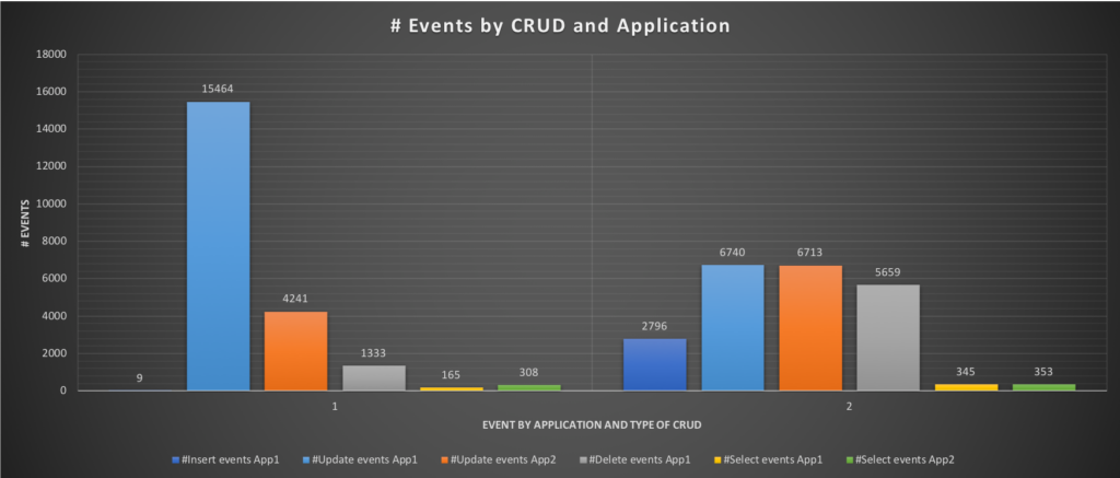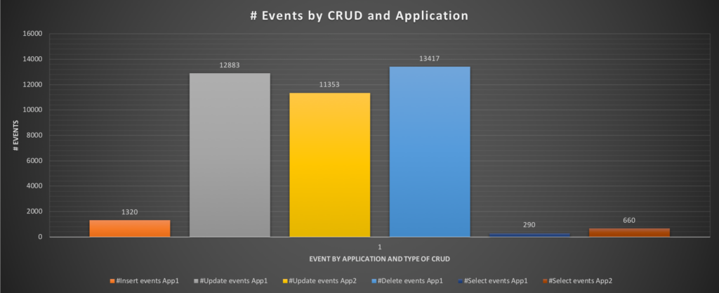 Execution time for insert, delete drops significantly for App1 and we can see that the application SHOULD be able to insert ~1320 events and perform a significantly higher number of operations. Same for App2, but here we care more about the OLTP than the ETL application.