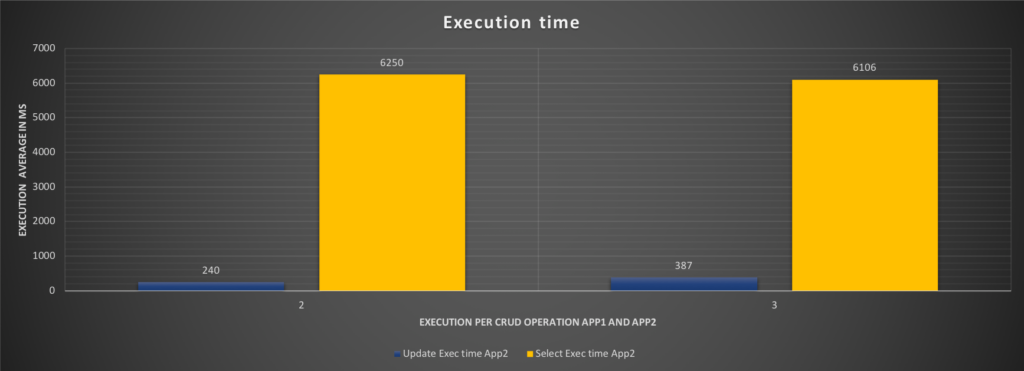 The execution graph indicates a very high time in Insert, and Delete for App1, with the results showing very bad performance only nine inserts, 1333 deletes, and 165 selects.