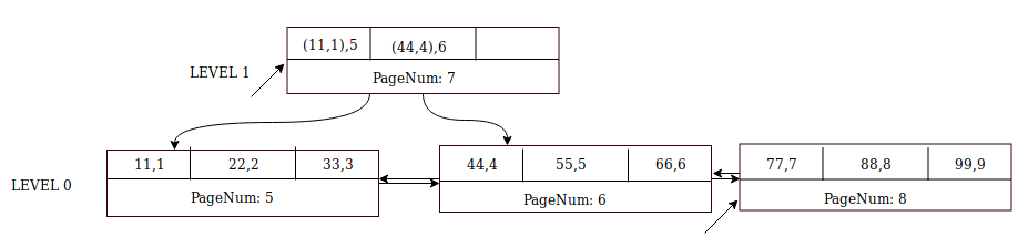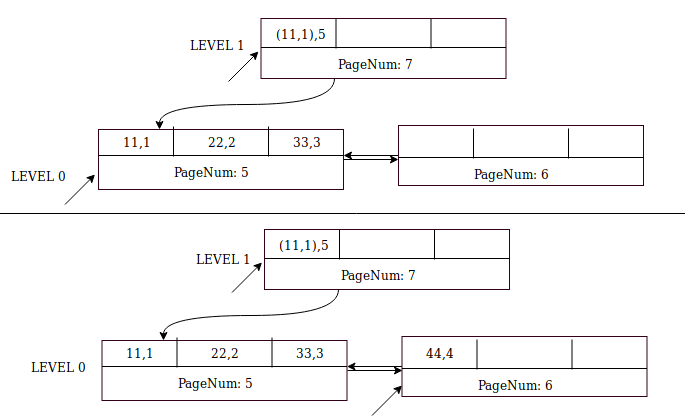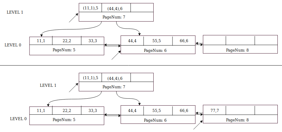 Insertion of record (77,7) is similar to (44,4) except that the parent page (page number 7) already exists and it has space for two more records. Insert node pointer ((44,4),8) into page 7 first, and then record (77,7) into sibling page 8.