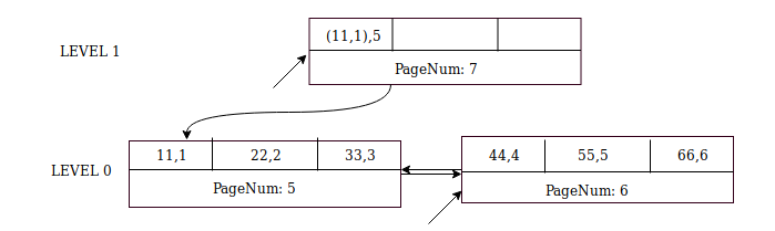 Commit the cursors at all levels. In the above example, the database commits page 9 at Level 0 and page 7 at Level 1. We now have a complete B+-tree index that is built from bottom-up!