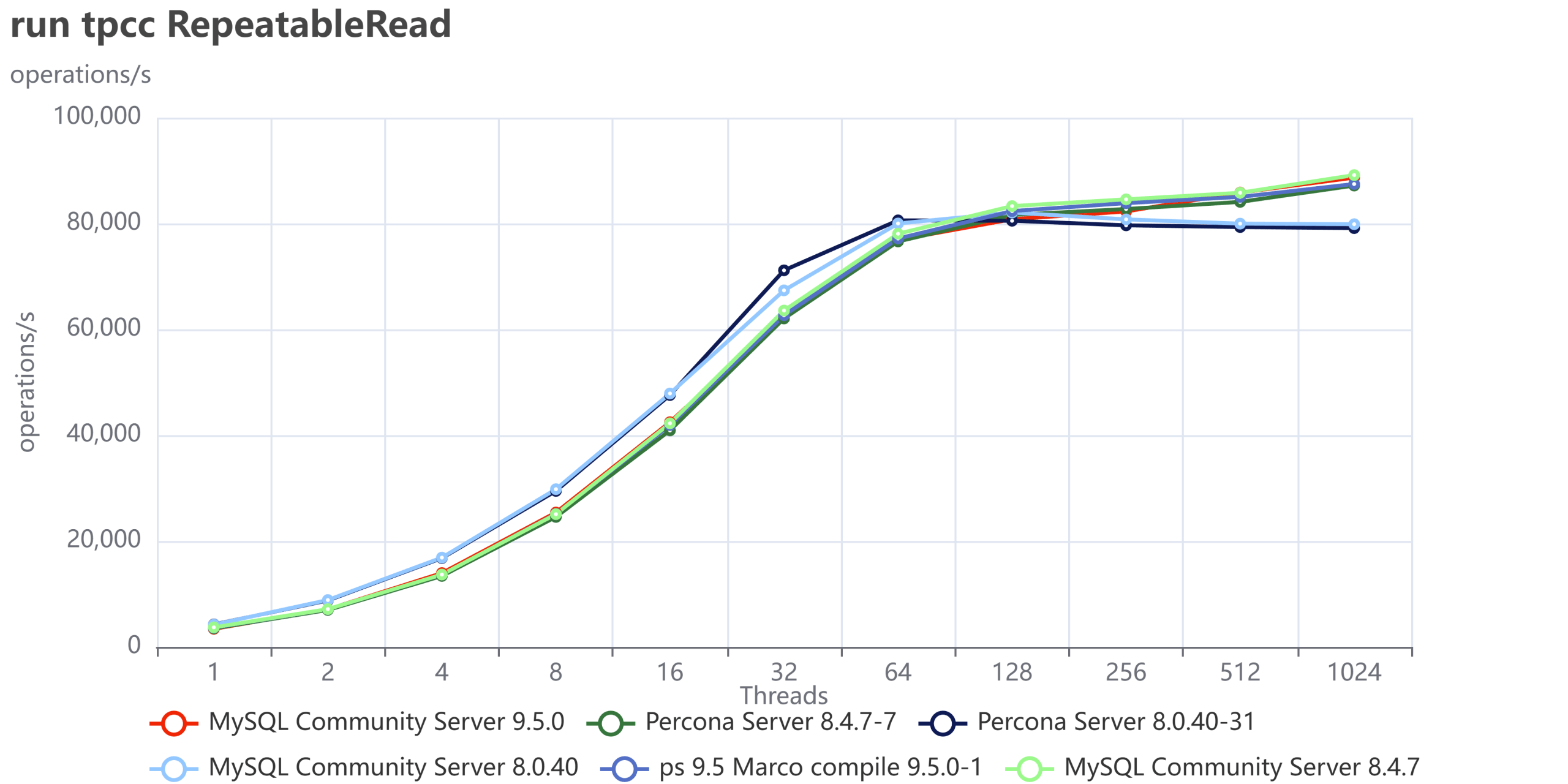 Given that while testing the single function, as we do with sysbench, it may be useful to identify regression points or so. To get the wide scenario, TPC-C is a better way to go, given it implies not only a more intense write load, TPC-C test is 50/50 r/w, but also a schema structure with relations, foreign keys and constraints. In short, it is closer to the common use of a relational database management system.