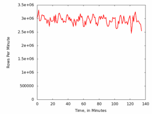 1. The overall downward slope of the line is steady enough to show that we did not cross a dramatic memory-to-disk threshold, as famously happens in B-Tree inserts (see InnoDB vs TokuDB for example). This doesn’t mean that we weren’t IO-bound; it might only mean that we were IO-bound the whole time waiting on fsync operations. But we didn’t go from a solely in-memory bottleneck to solely on-disk.