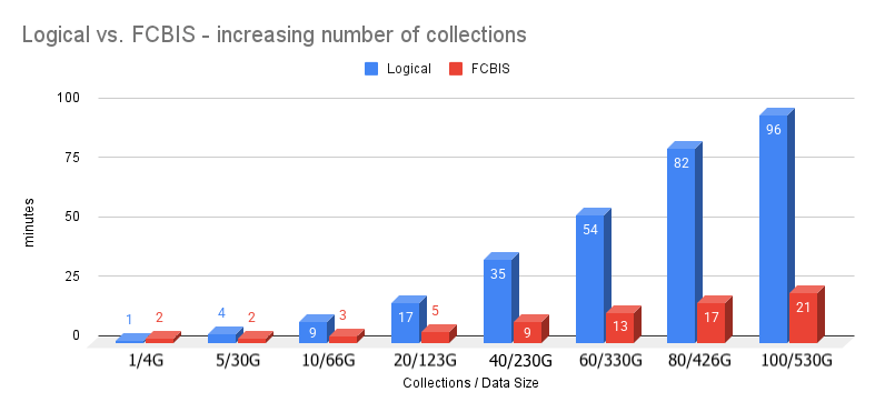 As expected, both methods take longer with more and more data, but the Logical increases almost exponentially with more collections than FCBIS, which looks linear instead. The ratio is from 2x to 4x, and it should further increase with even larger data sets.