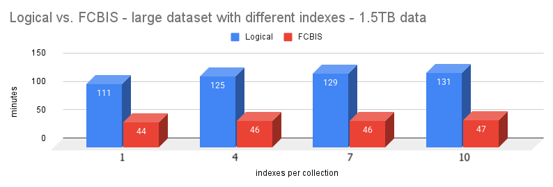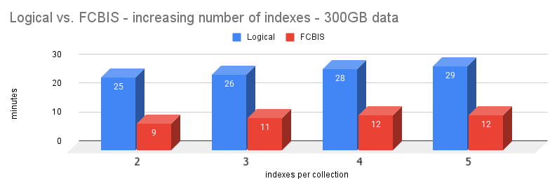 Again, FCBIS is from 2x to 3x faster than Logical. The ratio increases the more indexes we have per collection.