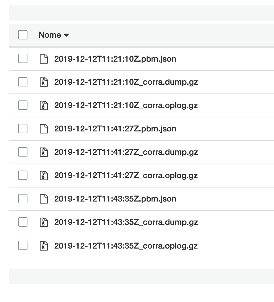 The picture below shows what you should see on AWS S3 if the streaming of the dump files worked as expected. The json file contains metadata about the backup, the other two compressed ones contain the documents of the collections and the oplog collection.