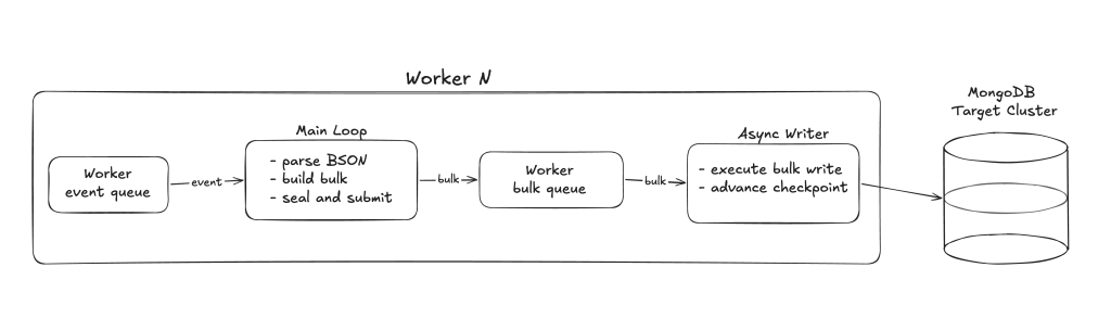 - Main loop — Reads events from its queue, parses BSON, and assembles bulk write operations. When a bulk is full (or the flush interval fires), it seals the bulk and submits it to a bounded queue. After the sealed bulk is queued, the loop continues processing events and building the next bulk without waiting.