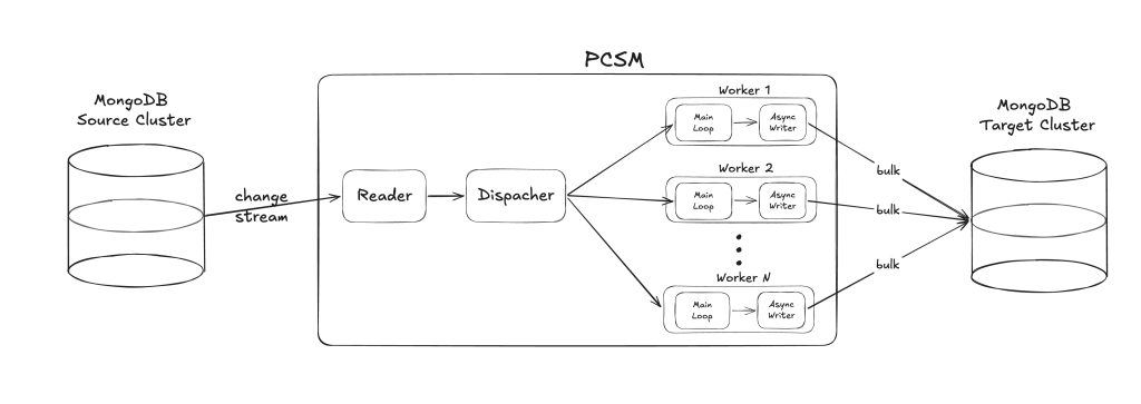 Percona ClusterSync for MongoDB (PCSM) replicates data between MongoDB clusters — whether replica sets or sharded — handling both the initial bulk data clone and continuous change replication via MongoDB’s change streams. It’s designed for migrations, failover preparation, and keeping a secondary cluster in sync with production.