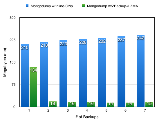 This graph compares the size added on disk for seven backups taken 10-minutes apart using two methods. The first method is mongodb_consistent_backup, with mongodump built-in gzip compression (available via the –gzip flag since 3.2) enabled. By default mongodump gzip is enabled by mongodb_consistent_backup (if it’s available), so this is a good “baseline”. The second method is mongodb_consistent_backup with mongodump gzip compression disabled and ZBackup used as the mongodb_consistent_backup archiving method, a post-backup stage in our tool. Notice each backup in the graph after the first only adds 14-18mb to the disk usage, meaning ZBackup was able to recognize similarities in the data.
