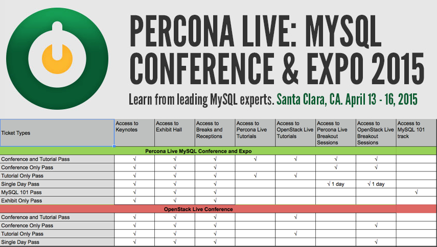 For full conference schedule details please visit the Percona Live MySQL Conference and Expo website and the OpenStack Live Conference Website!