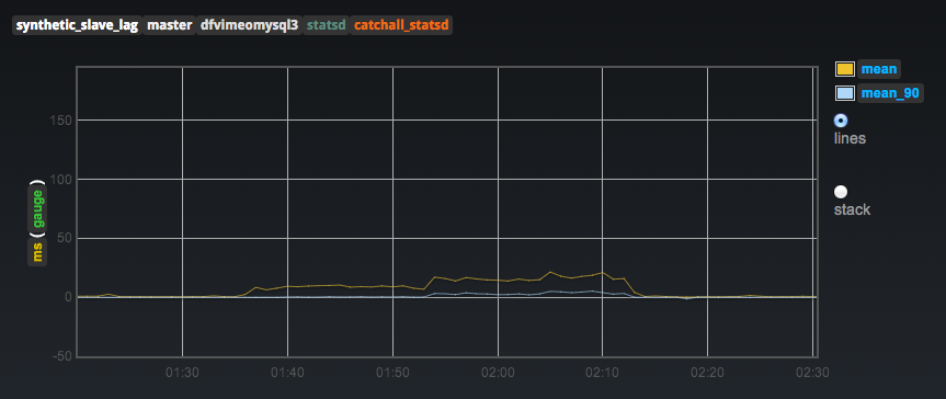 In this model, the update thread publishes the timestamp that was set on the master and each monitor thread simply waits as a consumer and then checks the timestamp on the slave vs the published timestamp. Synchronization is built in using this model and we saw much more accurate results. As opposed to sitting at 5-10ms all the time with spikes up to 50ms, we found 0ms in most cases (keep in mind that means 0ms from an application standpoint with network latency, time to process the query, etc) with spikes up to 40ms. Here is a sample graph (from Graph Explorer on top of statsd, courtesy of Vimeo) showing some micro spikes in delay that pointed us to a process that was now noticeable and able to be optimized: