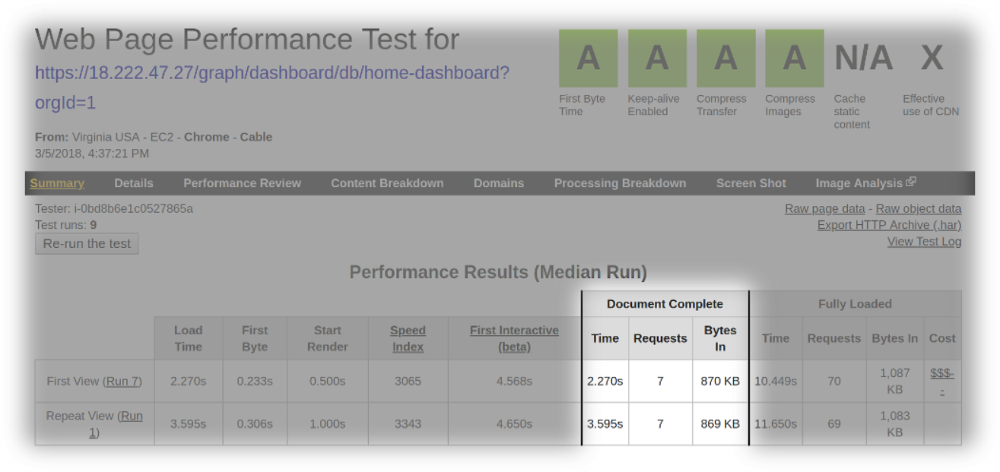 In Percona Monitoring and Management version 1.8.0, the index page was redesigned to reveal more useful information about the performance of your hosts as well an immediate access to essential components of PMM, however the index page had to load much data dynamically resulting in a noticeably longer load time. In this release we enabled gzip and HTTP2 to improve the load time of the index page. The following screenshots demonstrate the results of our tests on webpagetest.org where we reduce page load time by half. We will continue to look for opportunities to improve the performance of the index page and expect that when we upgrade to Prometheus 2 we will see another improvement.