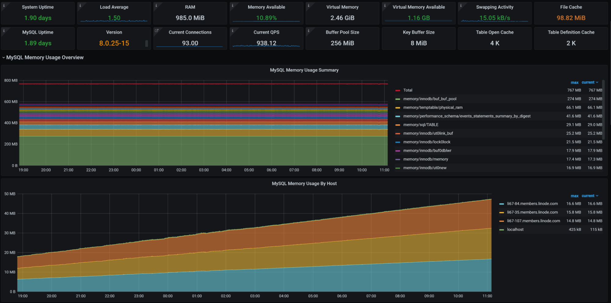 Ever wondered where MySQL memory usage comes from? This dashboard can shed a light on this dark place, showing the top global memory consumers as well as what users and client hosts contribute to memory usage. More details in the Understanding MySQL Memory Usage with Performance Schema blog post.