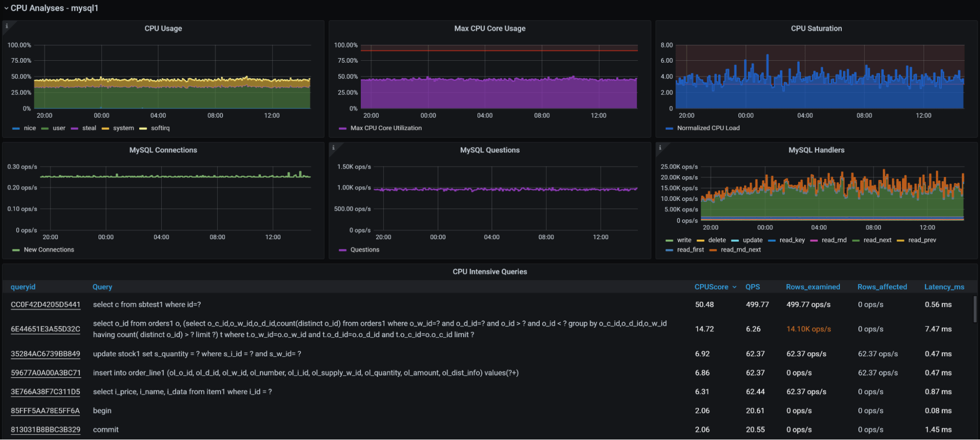 Want to understand which queries are responsible for CPU, Disk, Memory, or Network Usage and get some other advanced MySQL Query Troubleshooting tools? Check out this dashboard. Read more about it in the MySQL Query Performance Troubleshooting blog post.