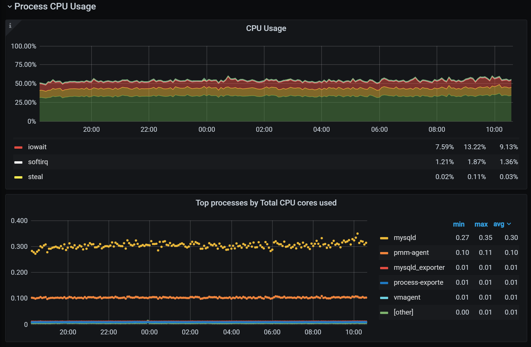 Note: Node Processes and MySQL Memory Usage Details dashboards also require additional configuration on the client-side. Check out the blog posts mentioned for specifics.