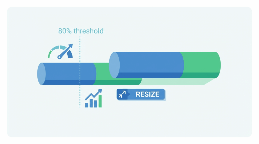 The Operator monitors storage usage and, when it exceeds your threshold, triggers resizing up to a maximum size you define.
