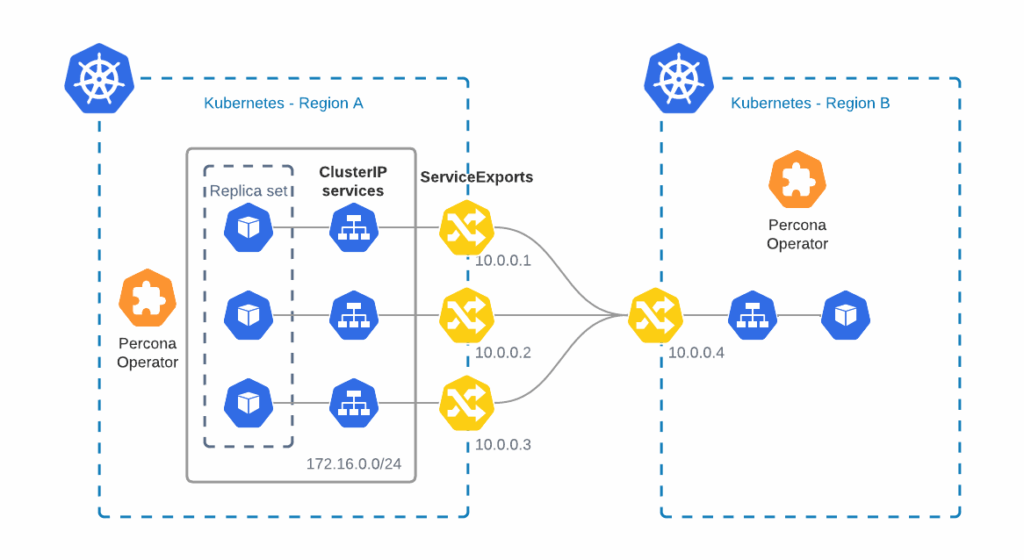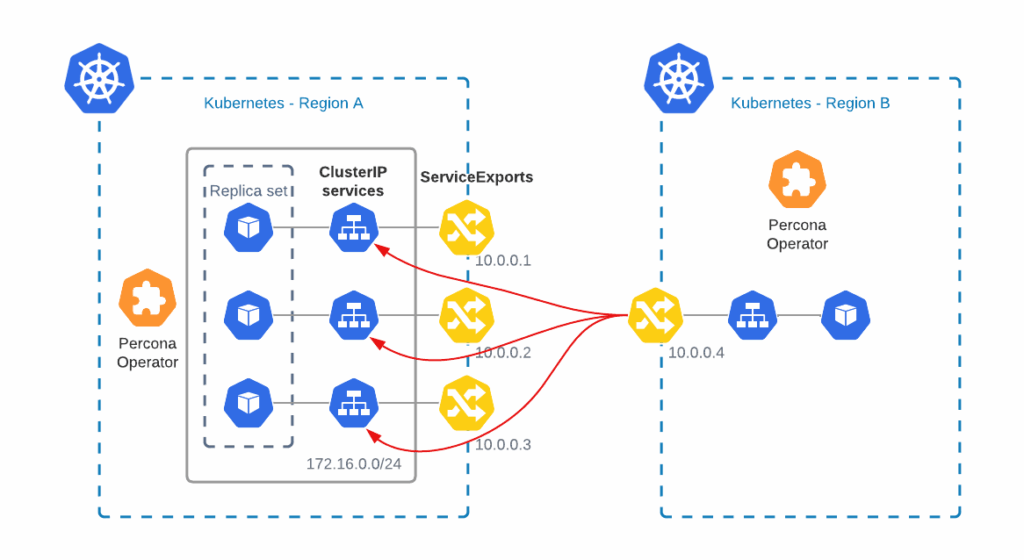 As you can see, Operator formed a replica set out of three nodes using svc.cluster.local domain, as it is how it should be done when you expose nodes with ClusterIP Service type. In this case, a node in Region B cannot reach any node in Region A, as it tries to connect to the domain that is local to the cluster in Region A.