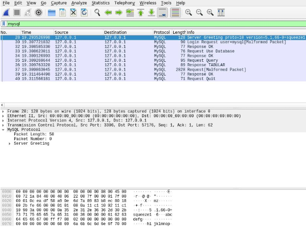 If you’re one whom enjoys CTF’s (Capture the flag) challenges, you may find a version of the above here: https://github.com/Oneiroi/ctf/tree/master/pcap/mysql/data_exfil this includes a pcap file showing a similar packet flow.