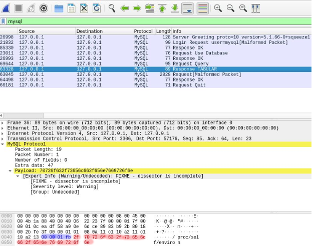I’ve highlighted the two key parts of this packet, the tail of mysql.packet_length (blue) which heads the request and the file path being requested (red).