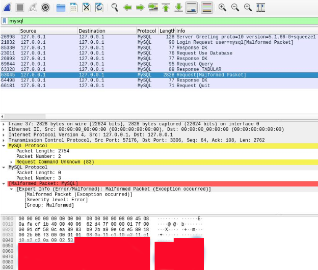 As shown here the complete TCP conversation flow between the MySQL binary client and MySQL ‘server’ (content has been redacted).