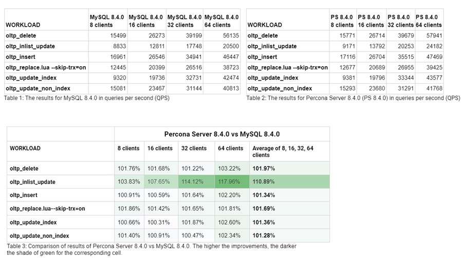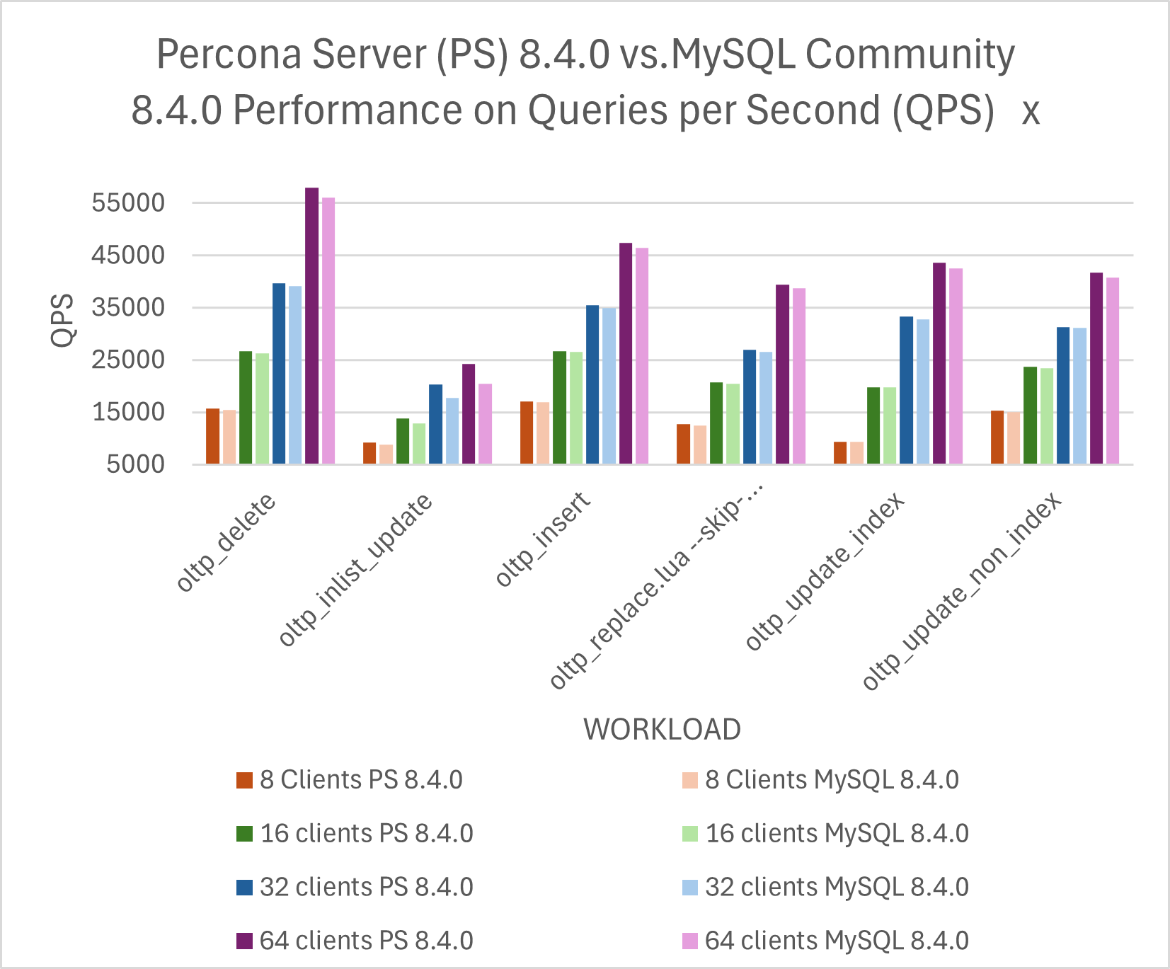 Write performance is up to 17% better in Percona Server 8.4 compared to MySQL 8.4. We have observed an average performance increase of 10.89% for oltp_inlist_update workload in Percona Server for MySQL compared to the MySQL Community Edition 8.4.0.