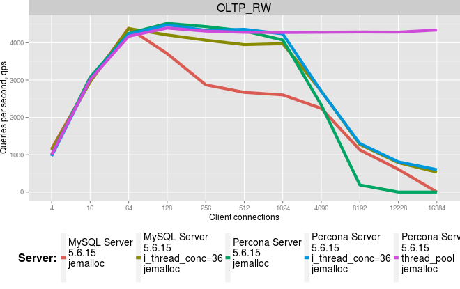 As you can see in both scenarios above, after 1024 threads, the standalone server is not really capable with keeping throughput at the same level. However, with thread_pool enabled the throughput is quite stable and smooth up to 16384 client connections.