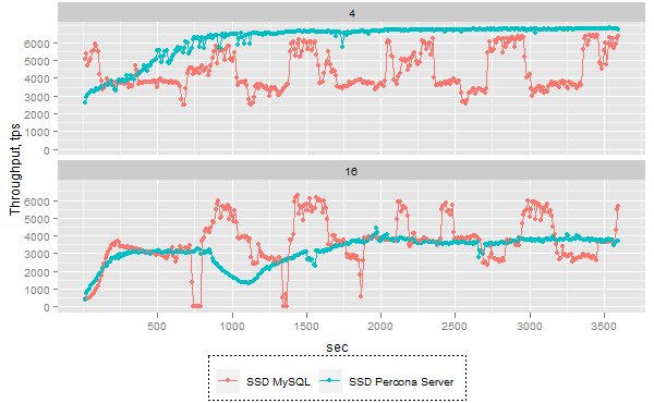 The Percona Server is still slower, but you say me, would you rather prefer a stable throughput or sporadic jumps ? Furthermore, there is a way to improve throughput in Percona Server: increase innodb_log_file_size.