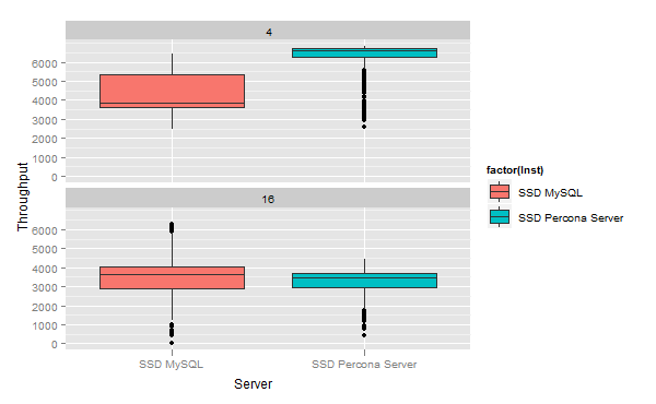 and compare the average (middle line inside box) for whole 1h run, we may get impression that average throughput for Percona Server is worse, because averages for 16 tables are: