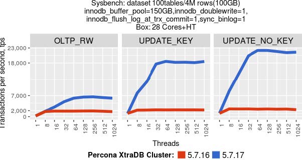 Below, you can see the benchmarks for improvements to Percona XtraDB Cluster 5.7 performance. You can read about the improvements and benchmark tests in more detail here and here.