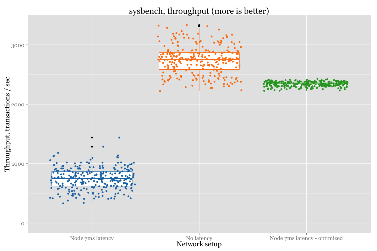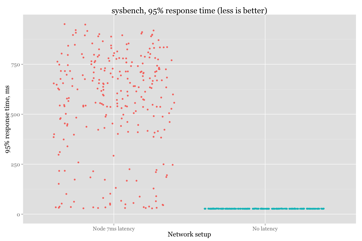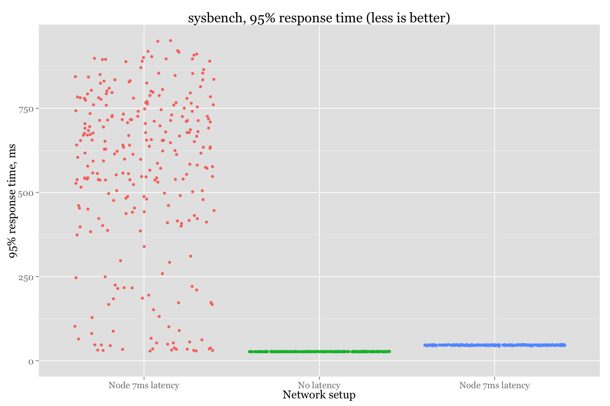 For the first example, all the nodes have equal latency (0.1ms), and for the second example we’ll introduce a 7ms latency to one of the nodes. You can easily do this in Linux with the following command: