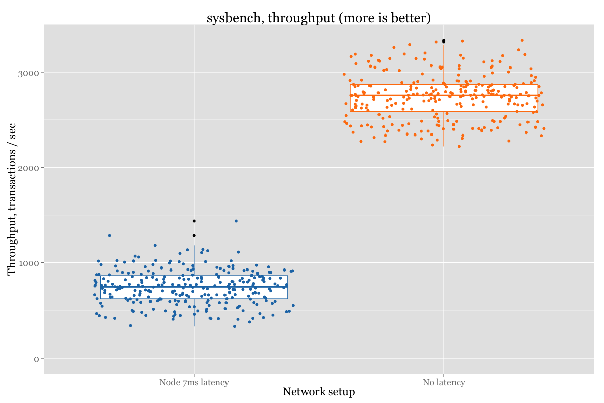 Performance of inserts/updates with big latency node was too poor comparing to single-node or cluster without big latency node included.