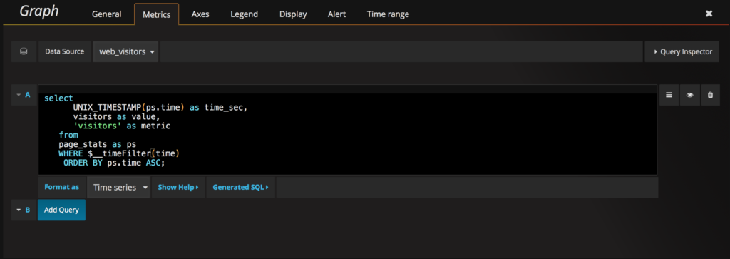 select<br> UNIX_TIMESTAMP(ps.time) as time_sec,<br> sum(visitors) as value,<br> 'visitors' as metric<br> from<br> page_stats as ps<br> WHERE $__timeFilter(time)<br> GROUP BY DATE_FORMAT(`time`, '%Y-%m-%d %H:%i')<br> ORDER BY ps.time ASC; |