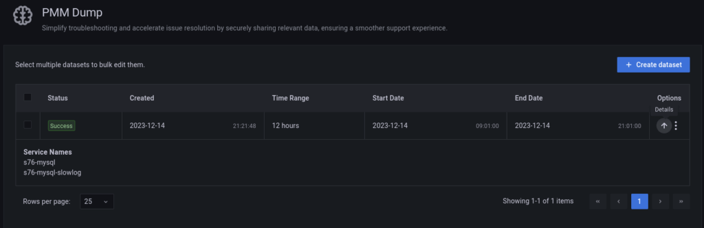 After you click the “Create dataset” button, a dump will be created and available on the PMM Dump dashboard.