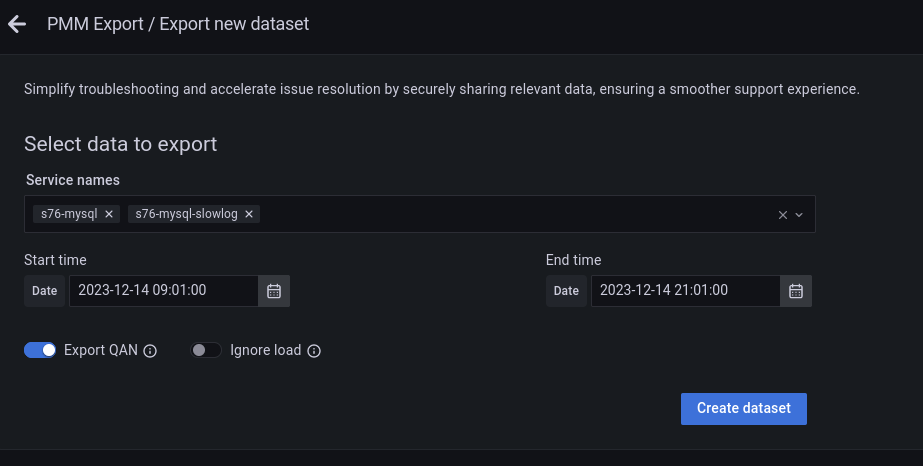 After you click “PMM Dump,” a new dashboard will be opened with a “Create dataset” button.