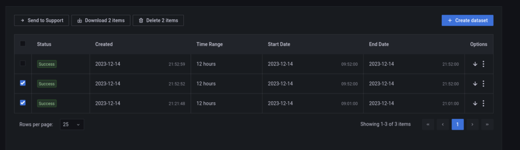 Choose a few dumps or click on the top checkbox to select all of them, then choose any of the available operations: “Send to Support,” “Download,” or “Delete.”